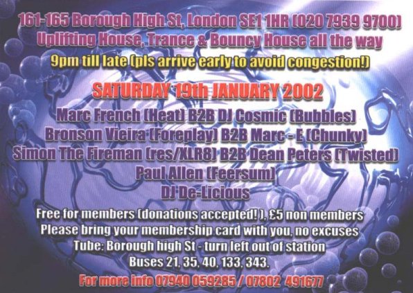 Bronson Vieira and Marc-E were banging it out when we arrived and we just knew that we'd taken the right decision coming along when we came in as the strains of Daniel Ro's latest track on the Peroxide label 'Jen/R/8' cranked out over the sound system. This little number is I reckon the first big tune of 2002 - OK, so it was released on promo late last year but it's only just out on full release. I heard it first at the Fridge and it set the place absolutely on fire and on the small dancefloor at Belushi's it was having the same effect - watch out for this one in the future boys and girls . The rest of their set was similarly paced, dropping in hard house classics alongside brand new tracks like Andy Farley's 'Connected' which is another cracking piece of vinyl.